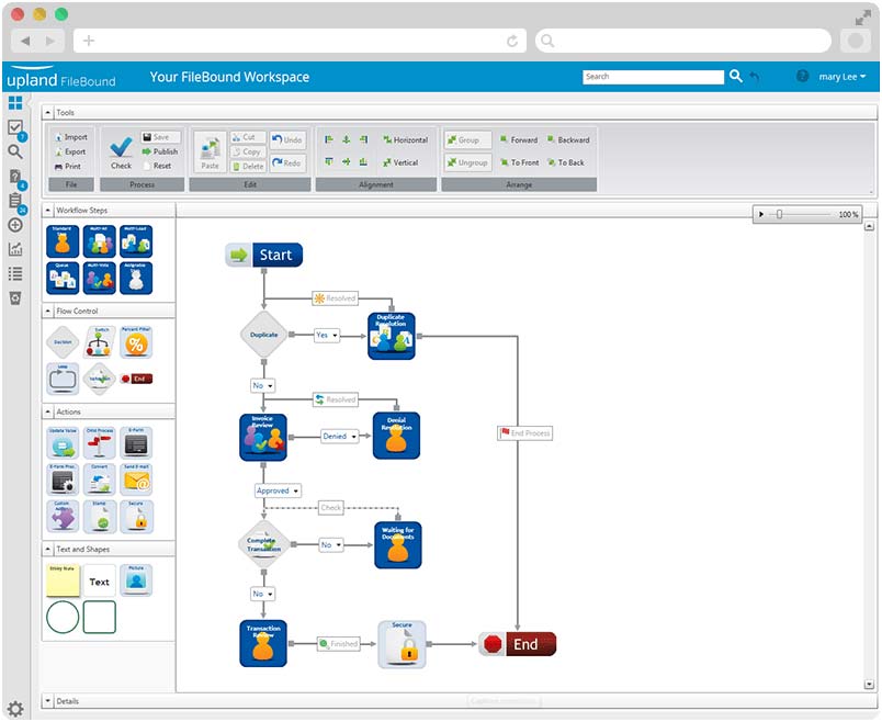 The hallmark of FileBound Workflow is its ease of use. Designed with user experience as a top priority, the graphical, drag-and-drop configurability allows users to easily automate even the most complex processes. This outstanding usability reduces training and configuration time, making it possible to develop solutions faster and see ROI sooner.