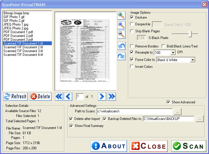 Not only does it let you use your central Multi-Function Device (copy machine) as a Virtual Scanner attached to each workstation, it also will allow you to virtually scan, via TWAIN, from most common image file formats (TIFs, JPGs, GIFs, etc) -- regardless of image source. In addition, Virtual TWAIN™ provides useful image manipulation abilities such as Blank Page Drop-Out, Border Removal, Force Black-and-White, Deskew, Despeckle, and more!